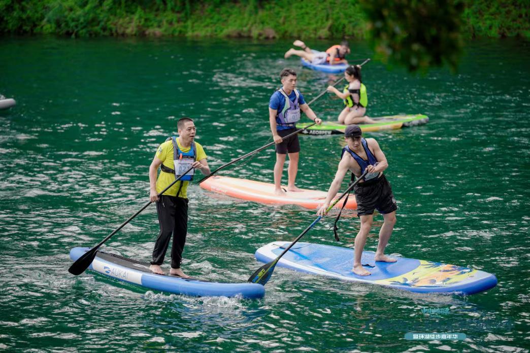 一艘艘赛艇如离弦之箭破浪前行,桨板在水面穿梭争先,岸边徒步爱好者整装出发,现场欢呼、呐喊、助威声此起彼伏,奏响自然与运动交融的华彩乐章。